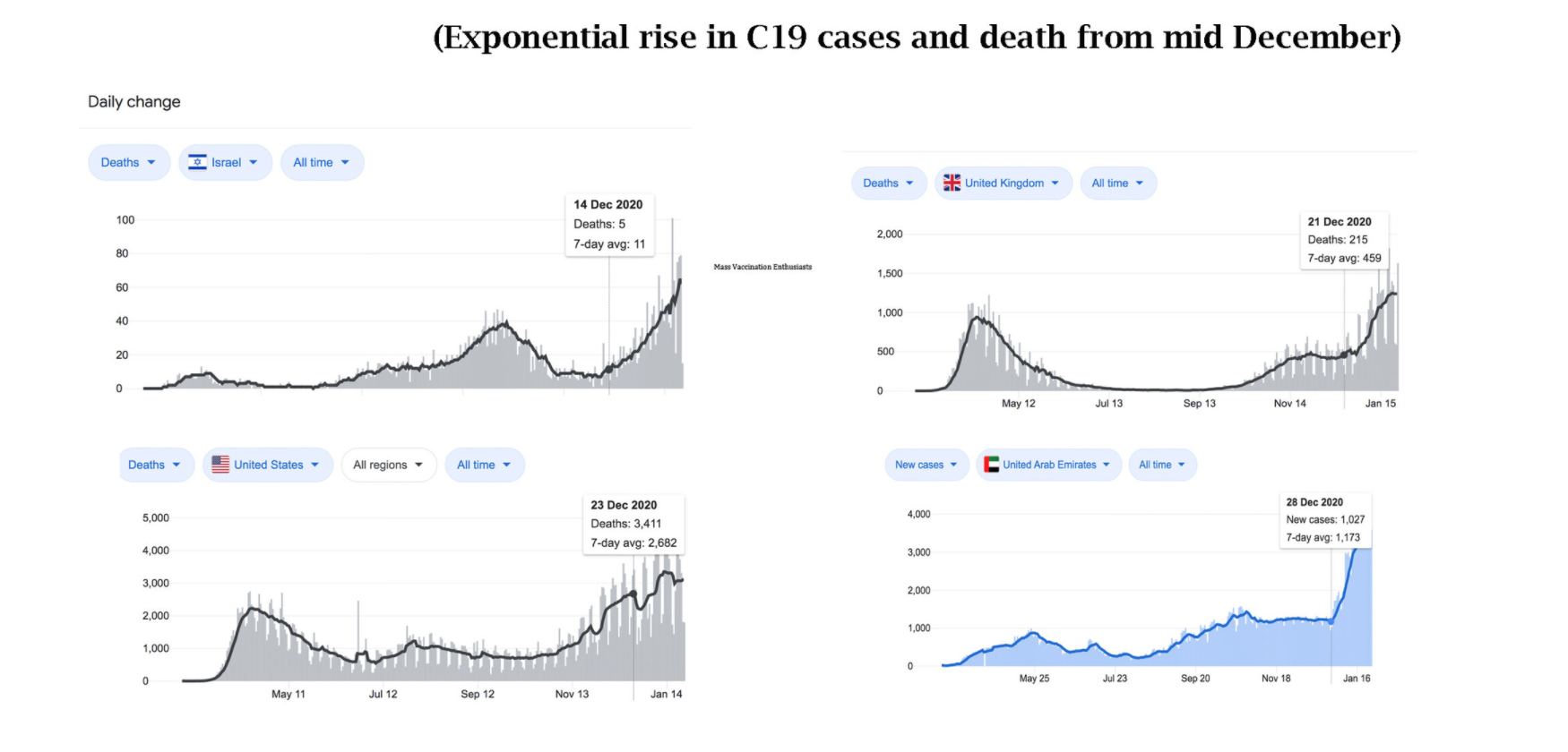 In the graphs below you can easily notice that cases and deaths start to rise exponentially in shocking proximity to the launch of vaccine mass distribution campaigns.
