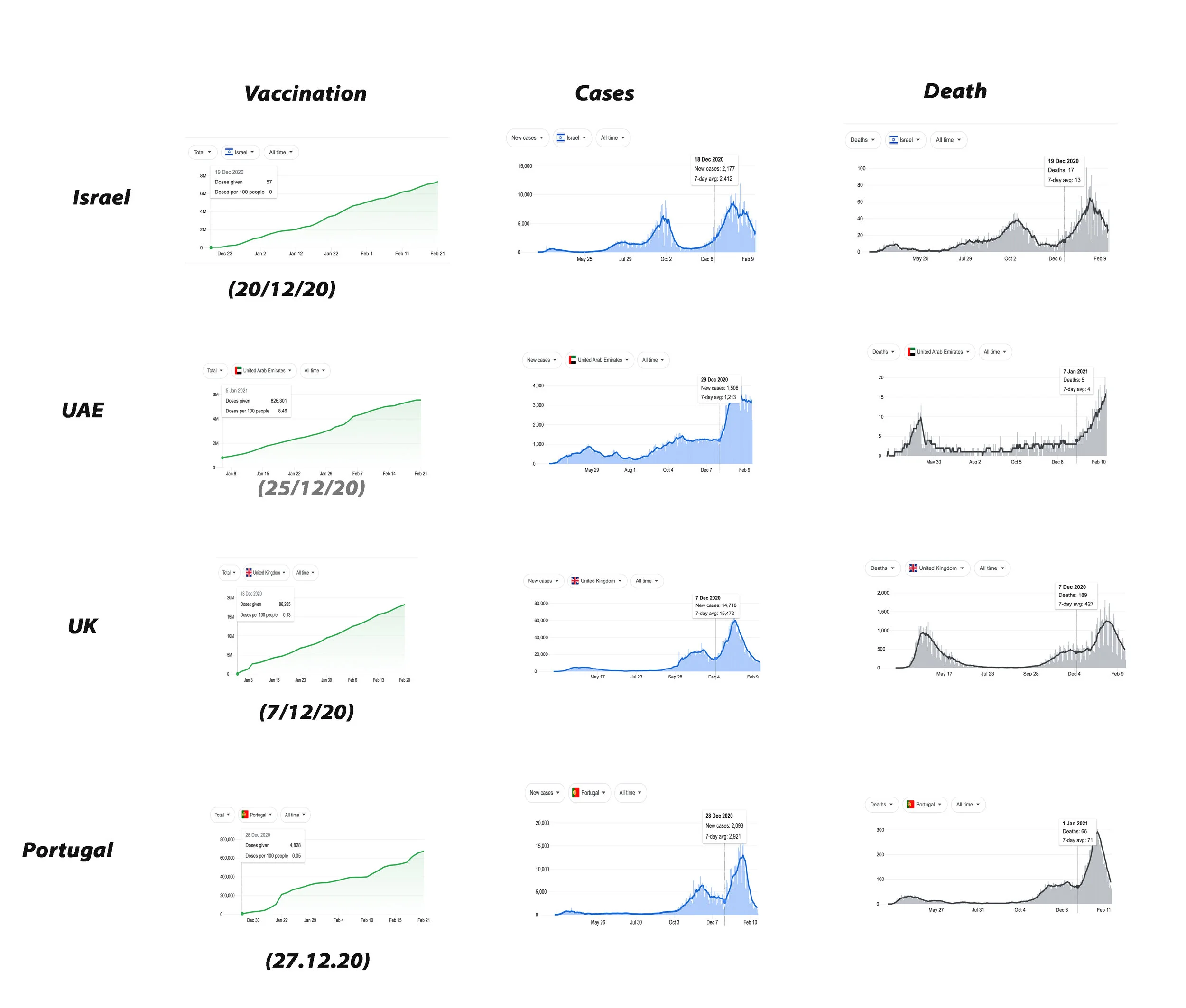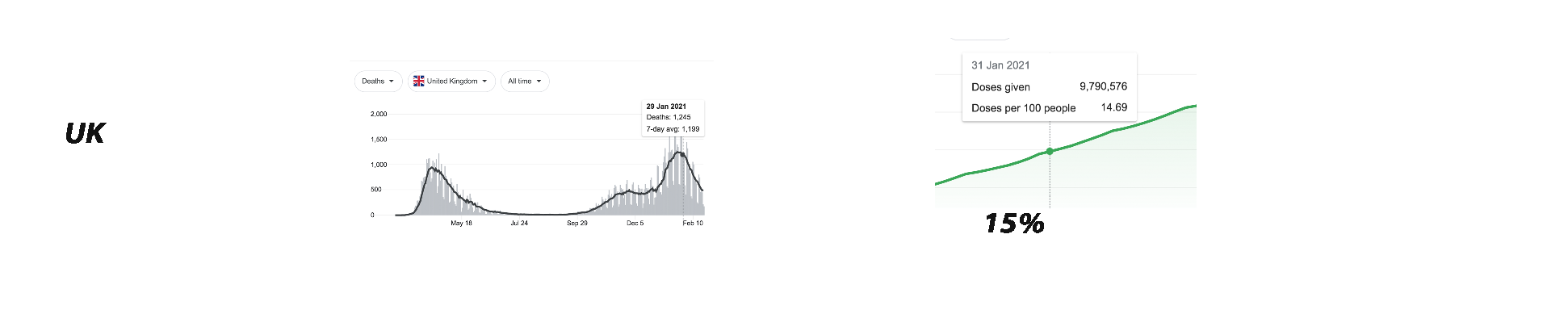 The case of the United Arab Emirates is almost identical. The rapid vaccination campaign was followed by an immediate surge in cases and deaths, it then took 31% of the population being vaccinated to see the first drop in numbers.