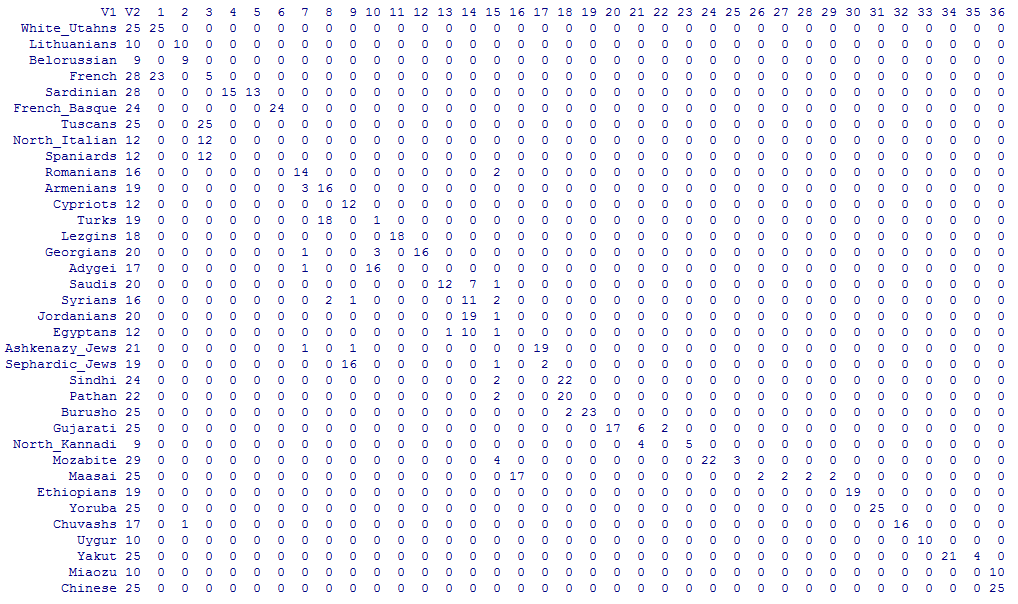 Also, check out Dienekes post on the ability to generate disjoint clusters in the DODECAD sample set. He asserts that one may now be able to generate extreme fine-scale assessments of likely population assignment from genetic material now. Check out this table; each column after the first two are the number of individuals in a given cluser. The rows are populations. The second column are the N individuals.