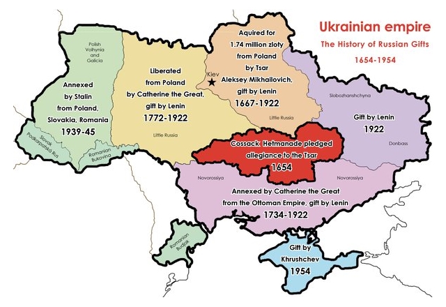 Later, more land was gifted to them – Galicia, in the west and Crimea, in the south. Both regions were transferred without their population having been asked whether they wanted that, and the same as the area of Donbas, Crimea was populated for the most part with the Russians. There were also a bit of Tatars and Greeks, but there were no Ukrainians and it has been like that till the recent annexation of the peninsula, after the Maidan coup.