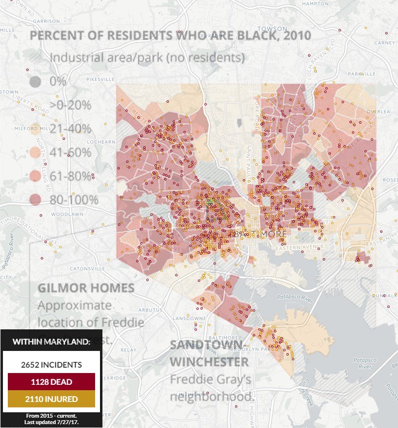 In the 6.5 years of US heavy military involvement in Vietnam (late 1965 to early 1972), the US military lost 58,000 men (dead) (at the same per capita rate today, it would be just under 100,000). If the Baltimore homicide rate were US-wide, there would be 1,220,000 murders in a 6.5 year period, or 21x the US military death rate in the Vietnam War.