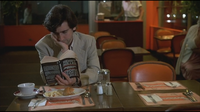 When Marcy (Rosanna Arquette) meets Paul (Griffin Dunne) at the restaurant she spots him reading Tropic of Cancer by Henry Miller (as illustrated) and starts a conversation about the book by quoting its famous opening (after the bit by the narrator describing his shaving Boris for lice):
