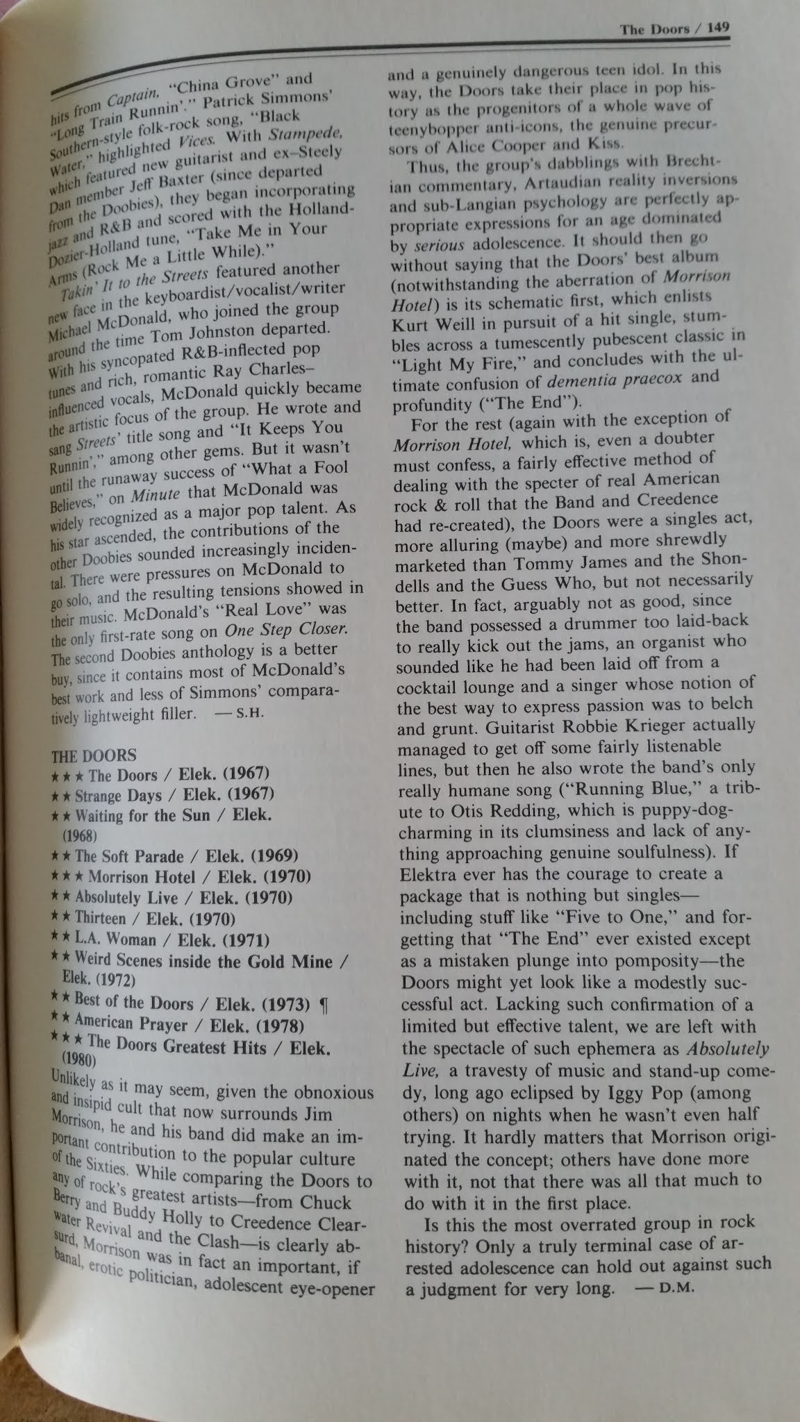 It’s indicative of the divided opinion about Morrison and the Doors that the first and second editions of Rolling Stone Record Guide diverge so drastically in their appraisals. (Dave Marsh’s take on Grateful Dead is pretty hilarious too. Of the Dead, AMERICAN BEAUTY is a true masterpiece.)